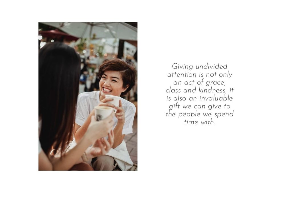 The risk of losing the exclusive in-person contact times with each other are high in our world today. Only the very self-controlled, self-aware and sensitive individuals will manage to retain the ethics of social interactions in the highly volatile digital sphere. Giving undivided attention is not only an act of grace, class and kindness, it is also an invaluable gift we can give to the people we spend time with.